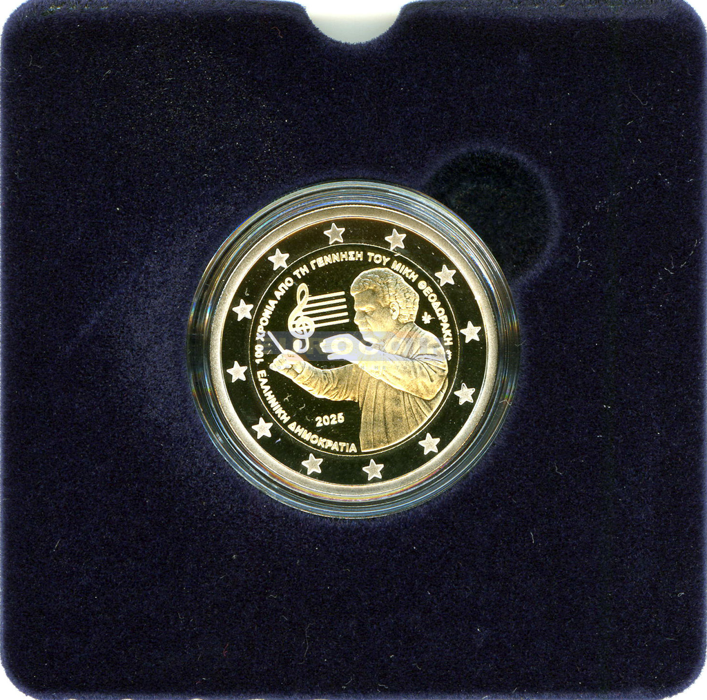 Греция 2 евро 2025, 100 лет со дня рождения Микиса Теодоракиса - ПРУФ