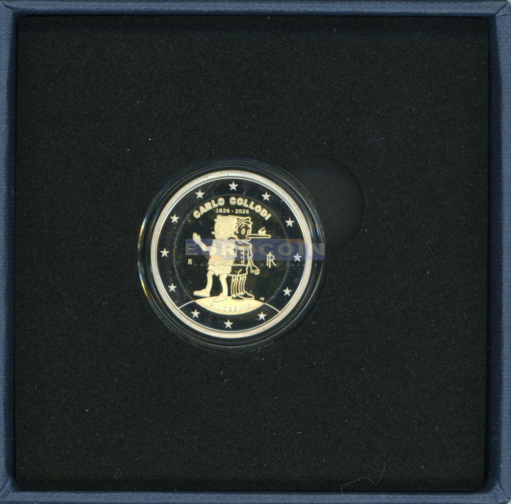 Италия 2 евро 2026, 200 лет со дня рождения Карло Коллоди - итальянский писатель и журналист, известный прежде всего своей знаменитой детской сказкой Пиноккио. - PROOF
