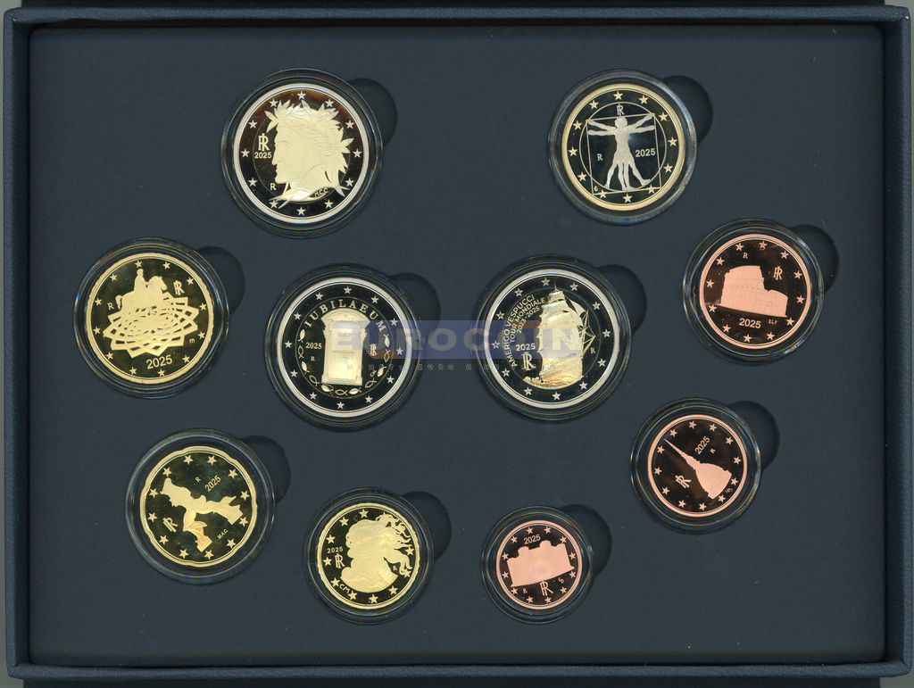 Италия, набор евро 2025 PROOF (10 монет) - 1 цент - 2 евро + 2 евро (Юбилейный год) + 2 евро (Америго Веспуччи)