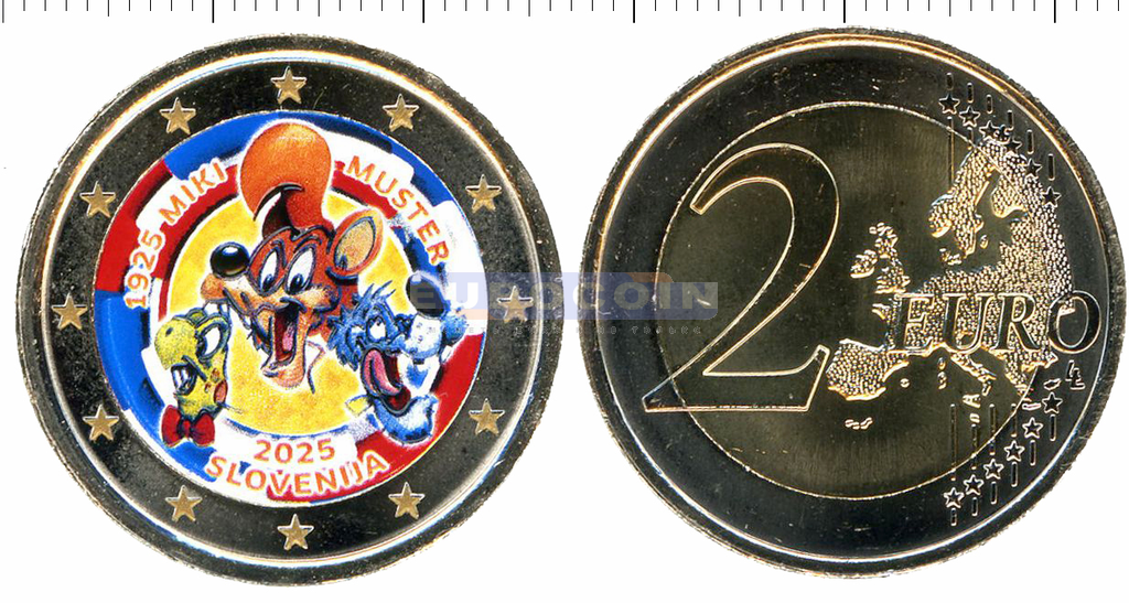 Цветная монета, Словения 2 евро 2025, 100 лет со дня рождения Мики Мустера