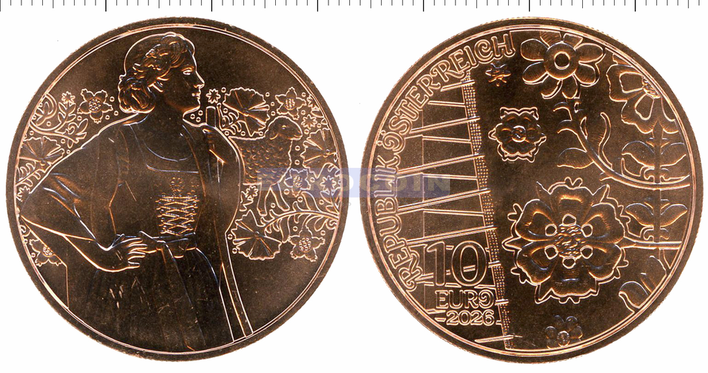 Австрия 10 евро 2026, Лоден - валяная шерстяная ткань альпийских фермеров и охотников - третья монета из серии «Национальная одежда Австрии»