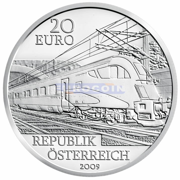 Австрия 20 евро 2009, Железная дорога будущего - шестая монета из серии, Австрийские железные дороги.