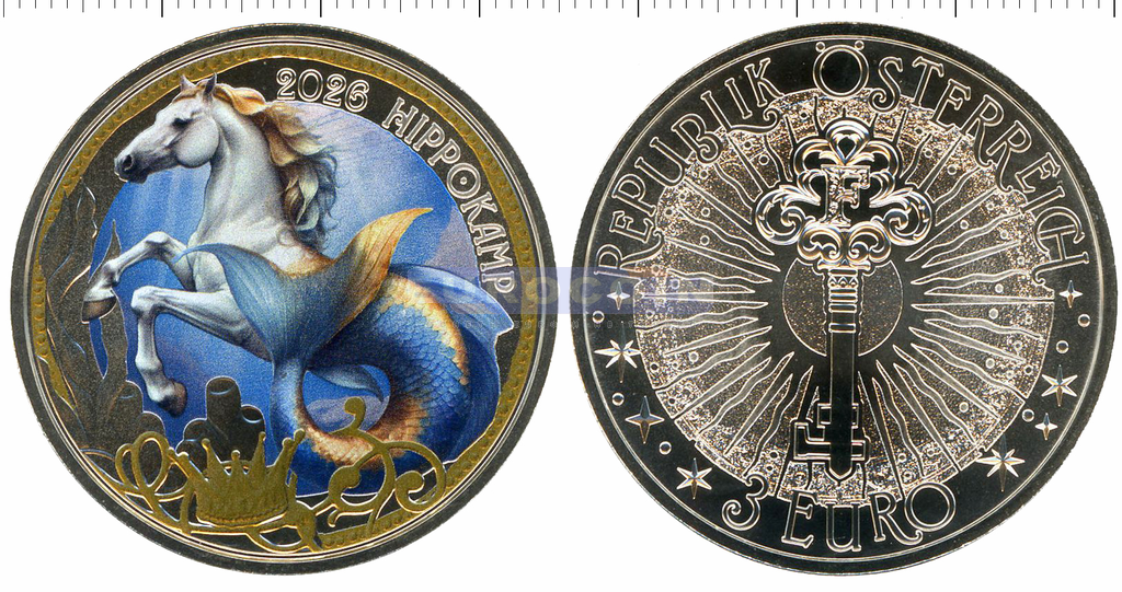 Австрия 3 евро 2026, «Гиппокампус» - фантастические и мифические существа