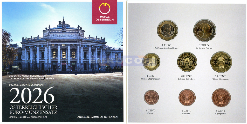 Австрия, официальный годовой набор евро 2026 BU (8 монет)