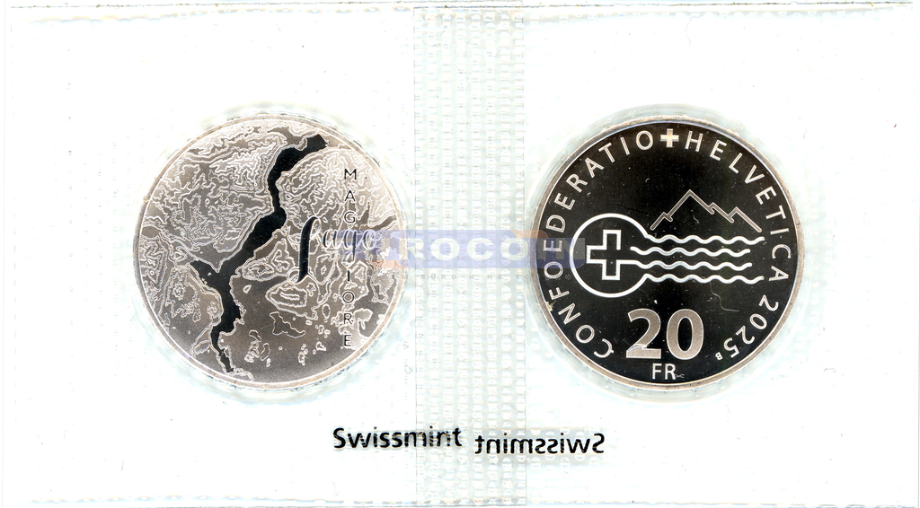 Швейцария 20 франков 2025, Лаго-Маджоре - озеро на границе Швейцарии и Италии.