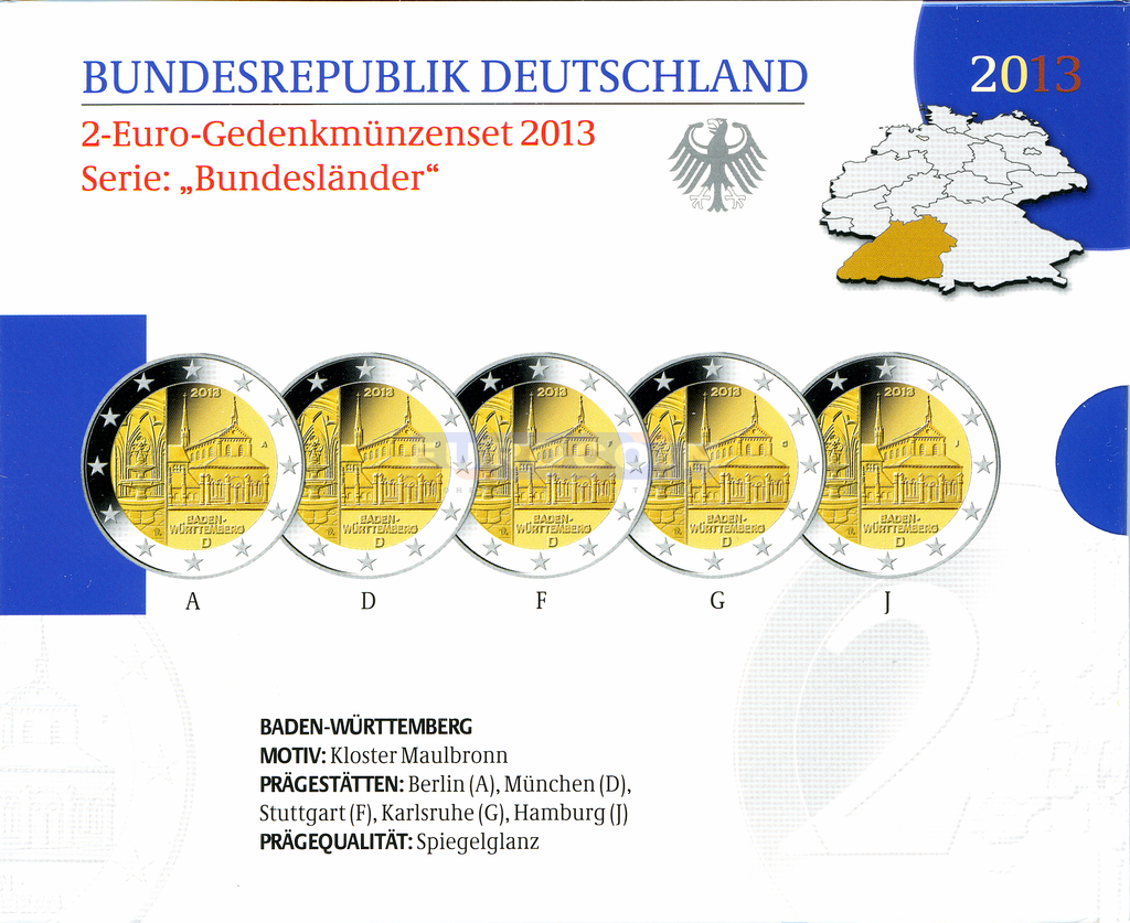 Германия 2 евро 2013, Восьмая монета серии «Федеральные земли Германии» — Баден-Вюртемберг (Монастырь Маульбронн), все монетные дворы (A,D,F,G,J) PROOF