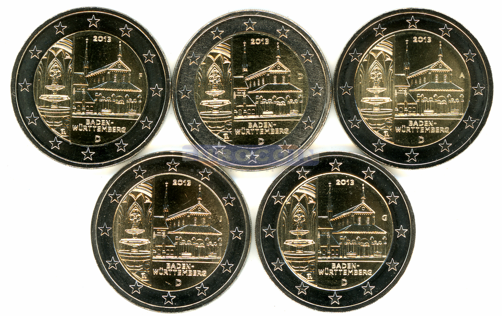 Германия 2 евро 2013, Восьмая монета серии «Федеральные земли Германии» — Баден-Вюртемберг (Монастырь Маульбронн), все монетные дворы (A,D,F,G,J)