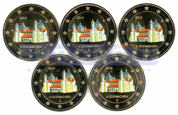 Цветные монеты, Германия 2 евро 2014, Девятая монета серии «Федеральные земли Германии» — Нижняя Саксония (Церковь Св. Михаэля в Хильдесхайме), все монетные дворы (A,D,F,G,J)