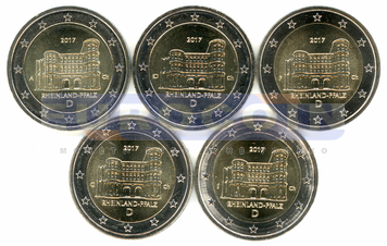 Германия 2 евро 2017, Двенадцатая монета серии «Федеральные земли Германии» — Рейнланд-Пфальц (Порта Нигра в Трире), все монетные дворы (A,D,F,G,J)