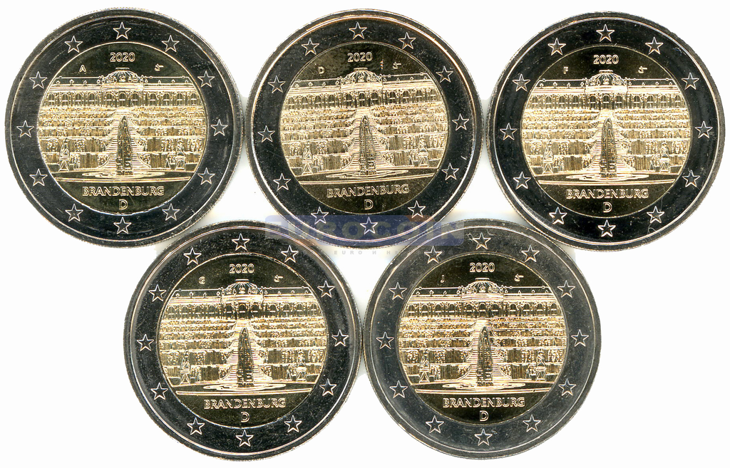 Германия 2 евро 2020, Четырнадцатая монета серии «Федеральные земли Германии» — Бранденбург (Дворец Сан-Суси), все монетные дворы (A,D,F,G,J)