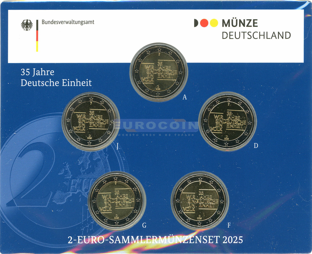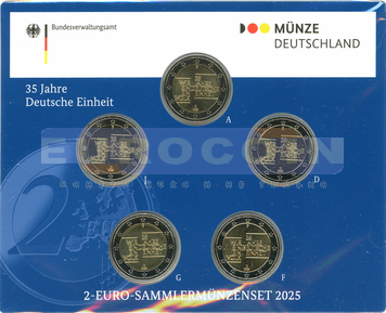 Германия 2 евро 2025, 35-летие объединения Германии, все монетные дворы (A,D,F,G,J) BU
