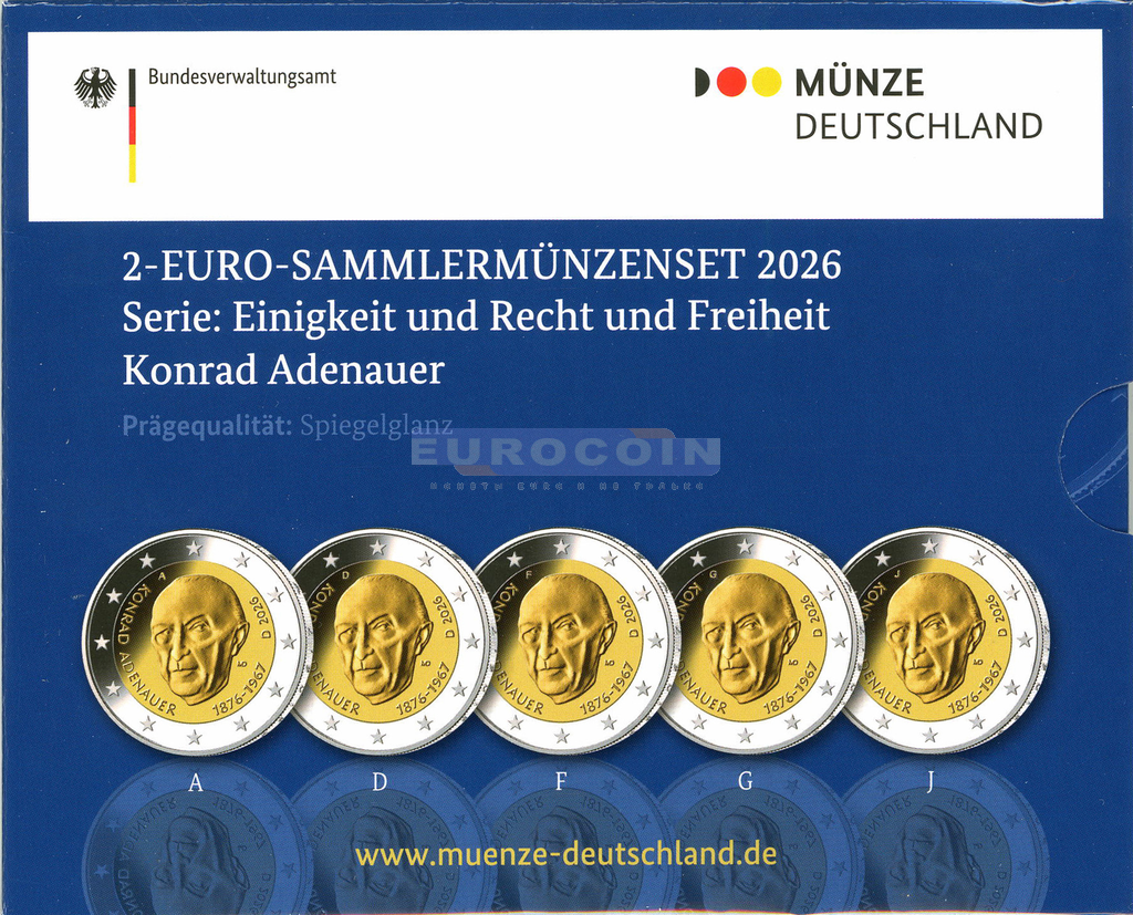 Германия 2 евро 2026, Конрад Аденауэр - немецкий государственный и политический деятель (A,D,F,G,J) PROOF