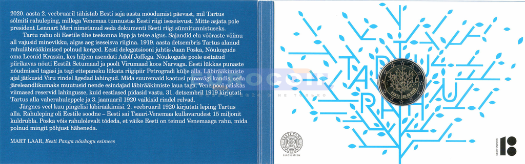 Эстония 2 евро 2020, 100 лет Тартускому мирному договору - BU