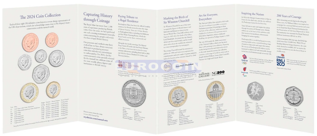 Великобритания, официальный годовой набор 2024 (13 монет): 1 - 50 пенсов - 1 и 2 фунта + 2 x 50 пенсов (Паралимпийские игры и Олимпийские игры) + 2 х 2 фунта (Сэр Уинстон Черчилль и Национальная галерея) + 5 фунтов (Букингемский дворец)