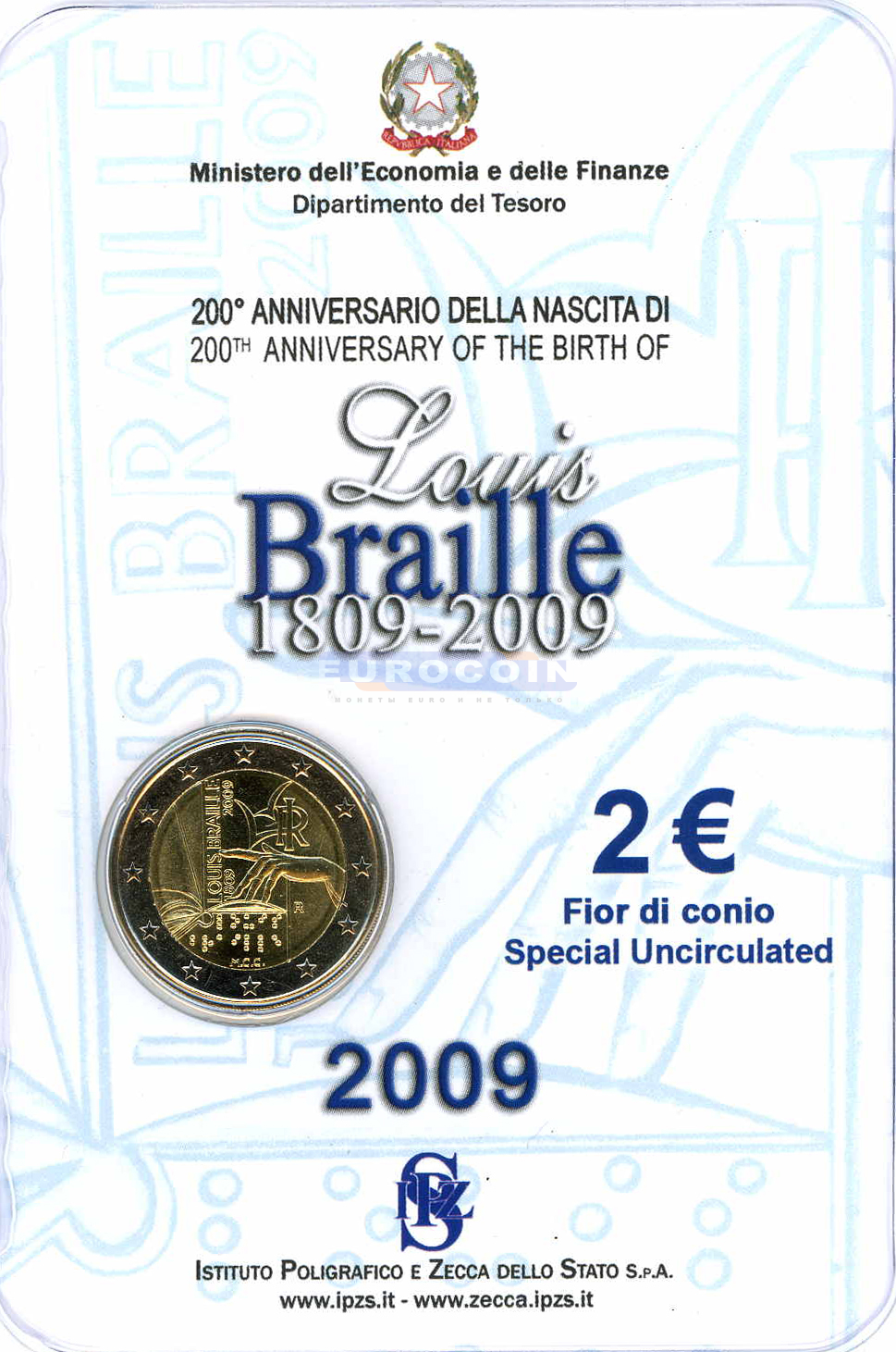 Италия 2 евро 2009 Луи Брайль BU