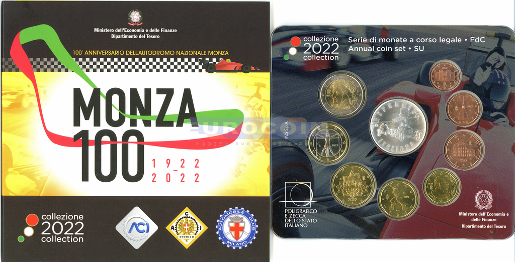 Италия, набор евро 2022 BU (9 монет) - 1 цент - 2 евро + 5 евро (Монца)