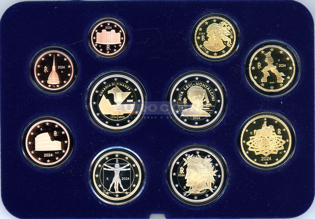Италия, набор евро 2024 PROOF (10 монет) - 1 цент - 2 евро + 2 евро (Финансовая гвардия) + 2 евро (Рита Леви-Монтальчини)