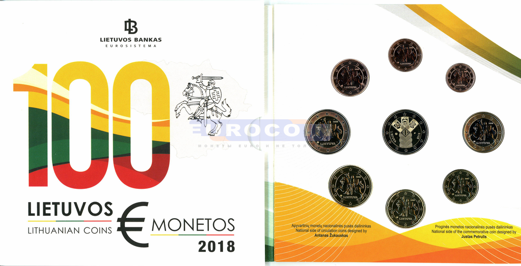 Литва, официальный годовой набор евро 2018 BU (9 монет): 1 цент - 2 евро + 2 евро (Независимость)