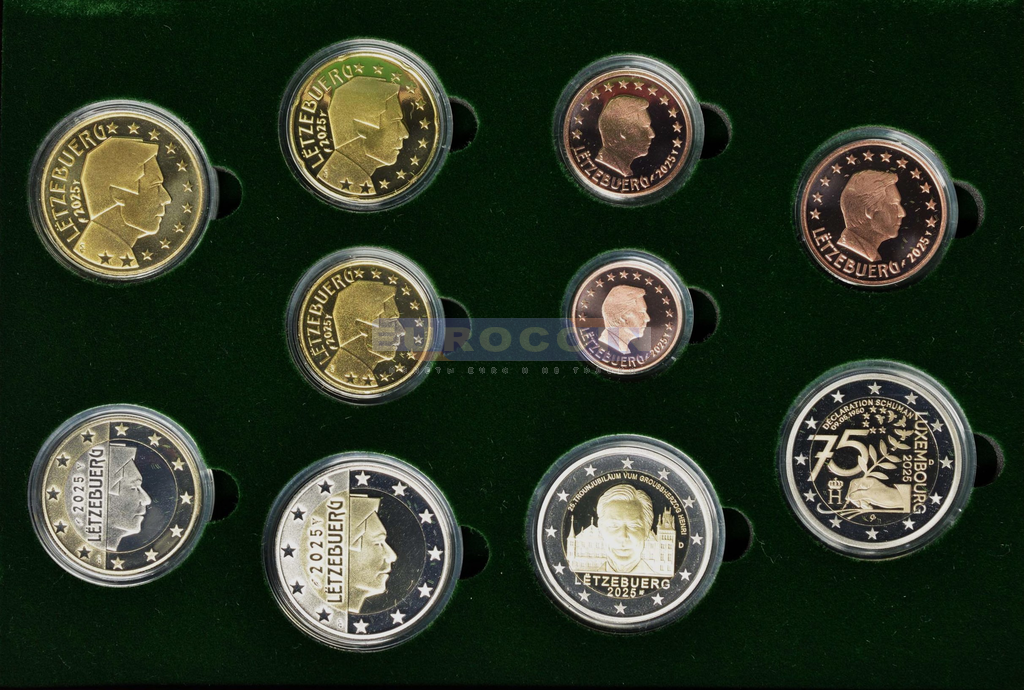 Люксембург, годовой евро набор 2025 PROOF (10 монет): 1 цент - 2 евро + 2 евро Вступление на трон Герцога Генри и декларация Шумана (Только в данном наборе монеты «Вступление на трон Герцога Генри» и «декларация Шумана» изготвленны в Германии)