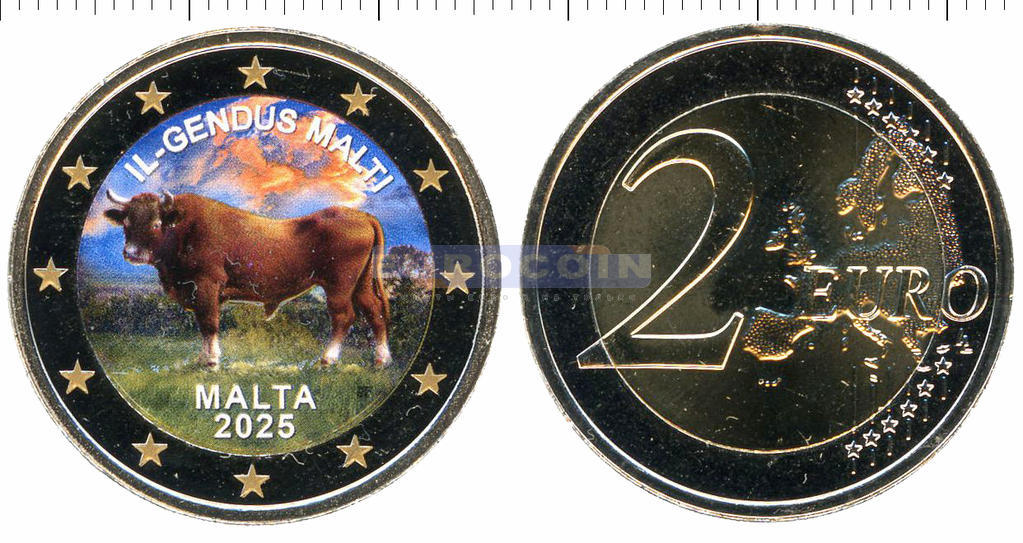 Цветная монета, Мальта 2 евро 2025, Мальтийский бык