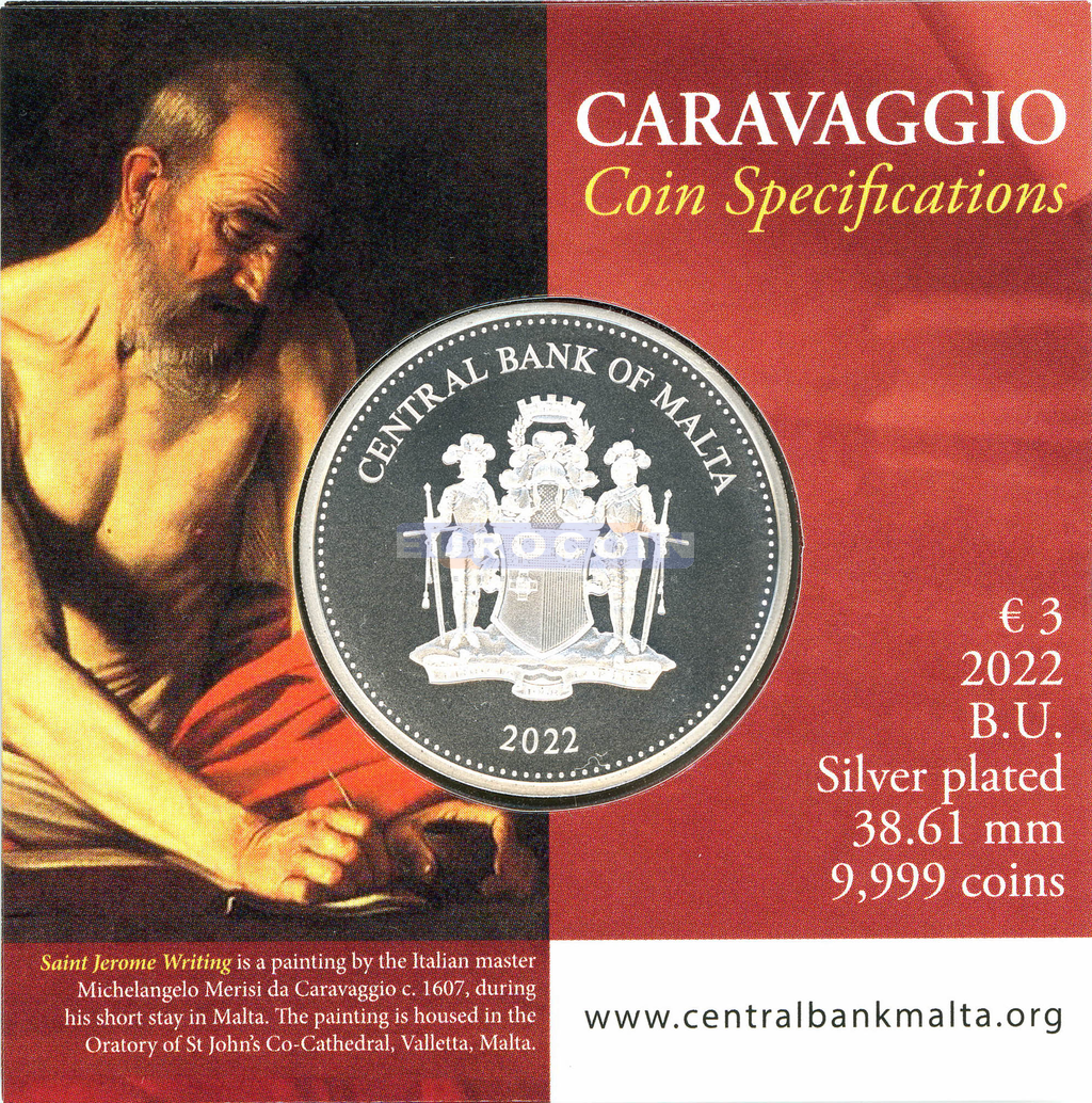 Мальта 3 евро 2022, 450 лет со дня рождения Меризи да Караваджо