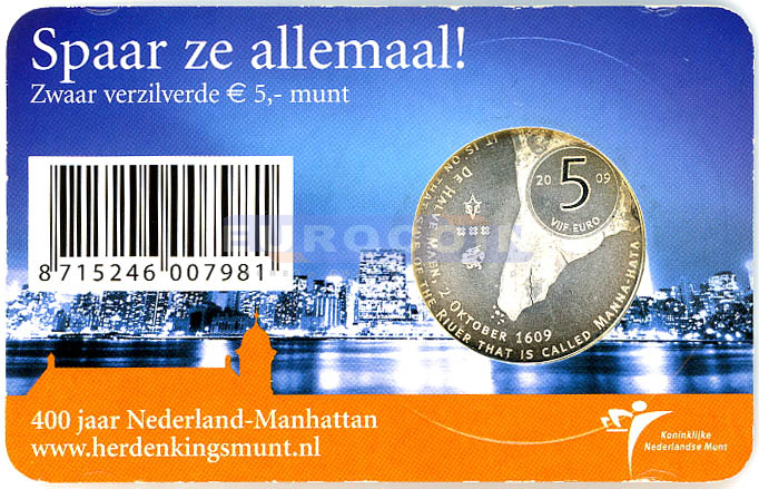 Нидерланды 5 евро 2009, 400 лет открытия о.Манхэттен