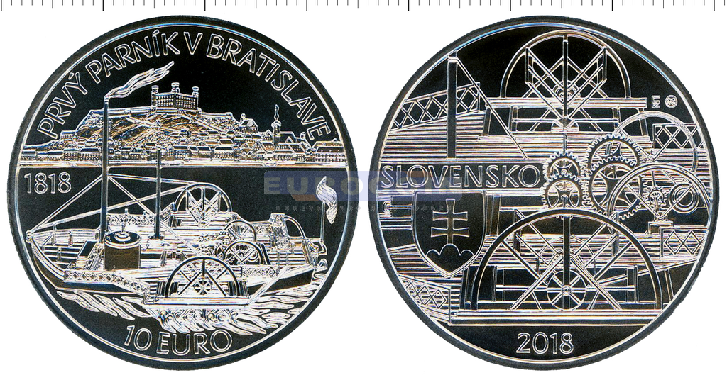 Словакия 10 евро 2018, 200 лет первому плаванию парохода по реке Дунай в Братиславе