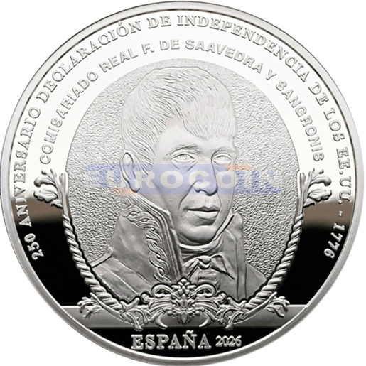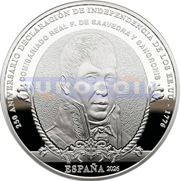 Испания 10 евро 2026, Франсиско Сааведра де Сангронис - испанский чиновник правительства и военный - монета из серии «250 лет провозглашения независимости Соединенных Штатов»