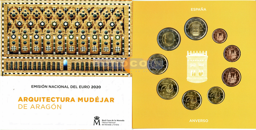 Испания, официальный годовой набор 2020 BU (9 монет): 1 цент - 2 евро + 2 евро (Арагон)