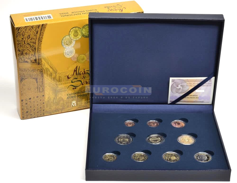 Испания, официальный годовой набор 2024 PROOF (10 монет) - 1 цент - 2 евро + 2 евро (Севилья и Полиция )
